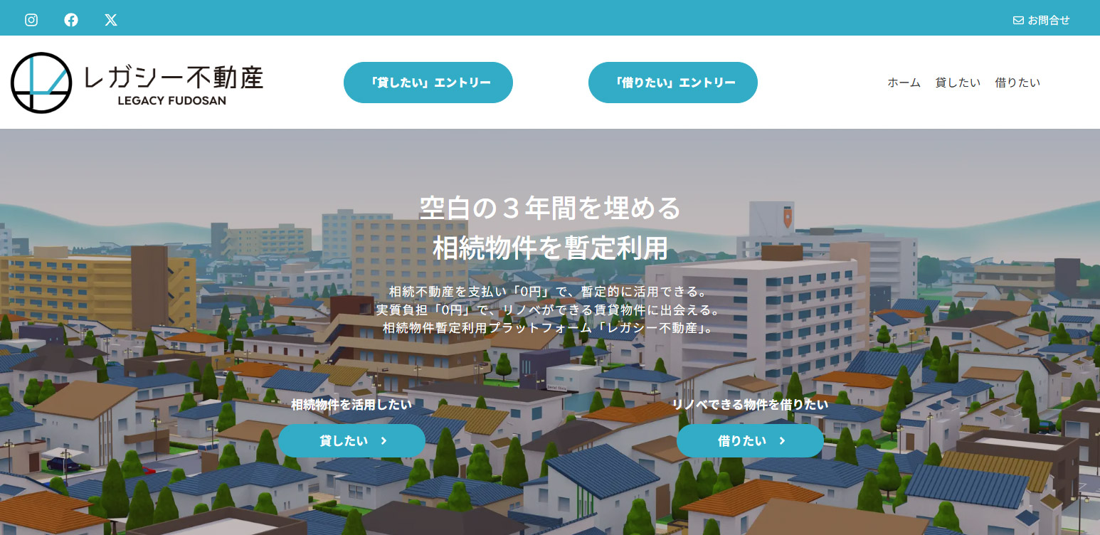 新サービス「レガシー不動産」は、親から相続するマンション、一戸建て、店舗などの不動産を、「空き家」になることを防ぐため、暫定的に賃貸物件として活用する「借りたい」と「貸したい」をつなげるプラットフォームです。